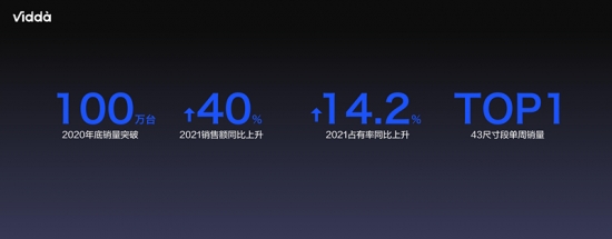 2019年,海信重启Vidda品牌拓展硬件产品,将其定义为年轻化电子潮牌,承担起海信抢占线上渠道年轻用户的品牌使命。据奥维数据,2020年,Vidda销量即突破了100万台,成为最具活力的消费电子新品牌之一。2021上半年,在行业销量同比大跌的态势下,Vidda销售额同比上升40%,市场份额上升14.2%。在43尺寸段,Vidda曾一度冲顶,所有电视产品中单周销量第一。